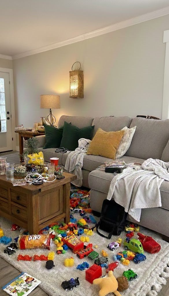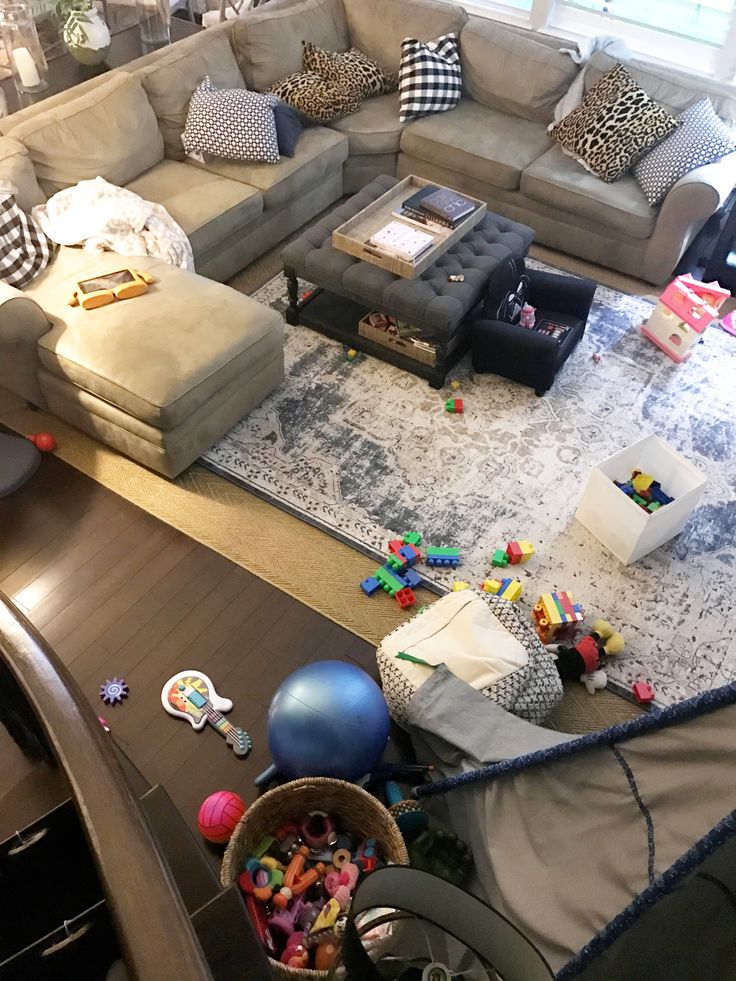 Toys all over the rug, piles of magazines and snacks on the coffee table, backpacks and blankets everywhere. It was the room everyone used, but nobody could actually relax in.