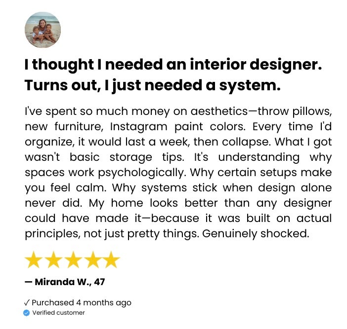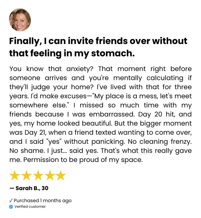 Perfect. Messier homes see BIGGER relief by Day 3. Your nervous system is already overwhelmed: once you reset one zone, you'll feel such a shift that you'll want to continue. The system is designed for chaos, not for Instagram homes.