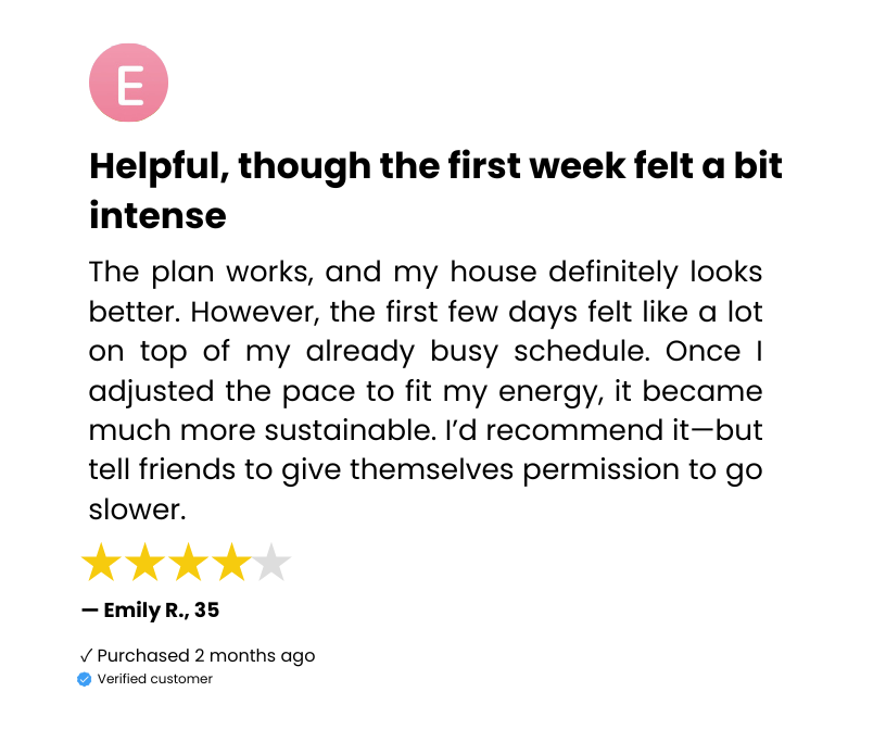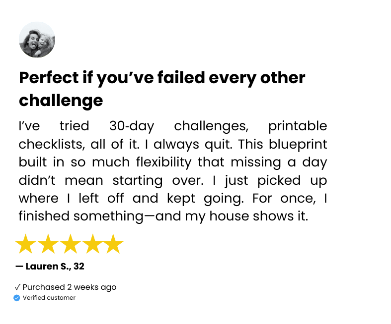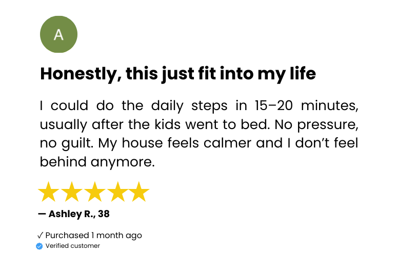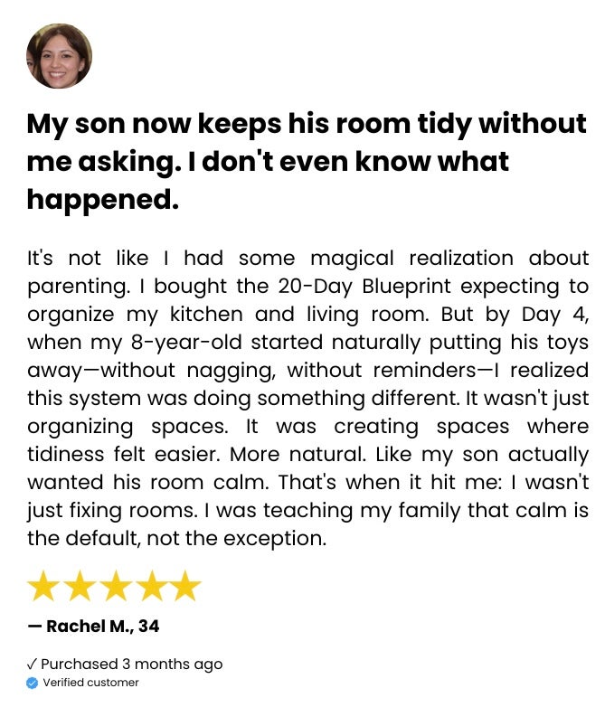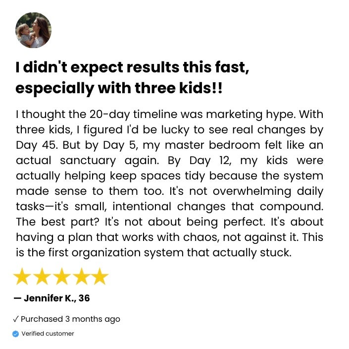 Yes! Because the system gives them ownership, not guilt. Each person gets ONE zone they manage (not the whole house). Kids are more likely to maintain something they "own." Day 16 has scripts for talking to your partner so it's not one more thing you manage alone. Teamwork = sustainability.