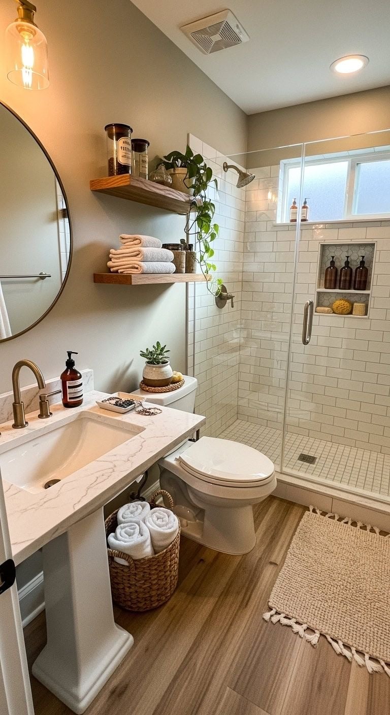 Clear surfaces, rolled towels in a basket, warm lighting, and a shower that finally feels like a mini spa instead of a storage zone.