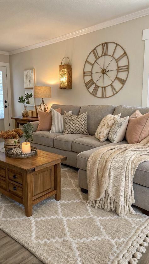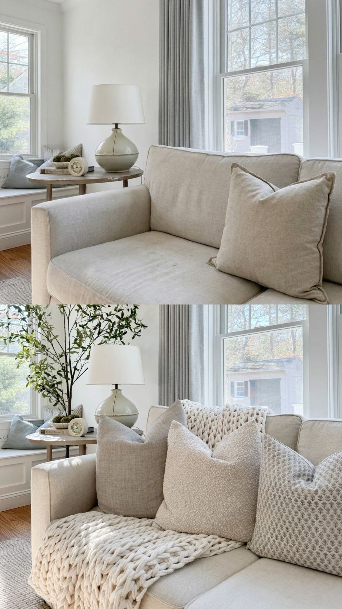 Day 20: Clear floor, a styled coffee table using the Rule of Three (tray + plant + candle), soft throw neatly folded, and a living room that finally feels calm, cozy, and guest‑ready.