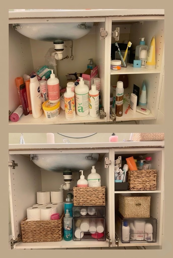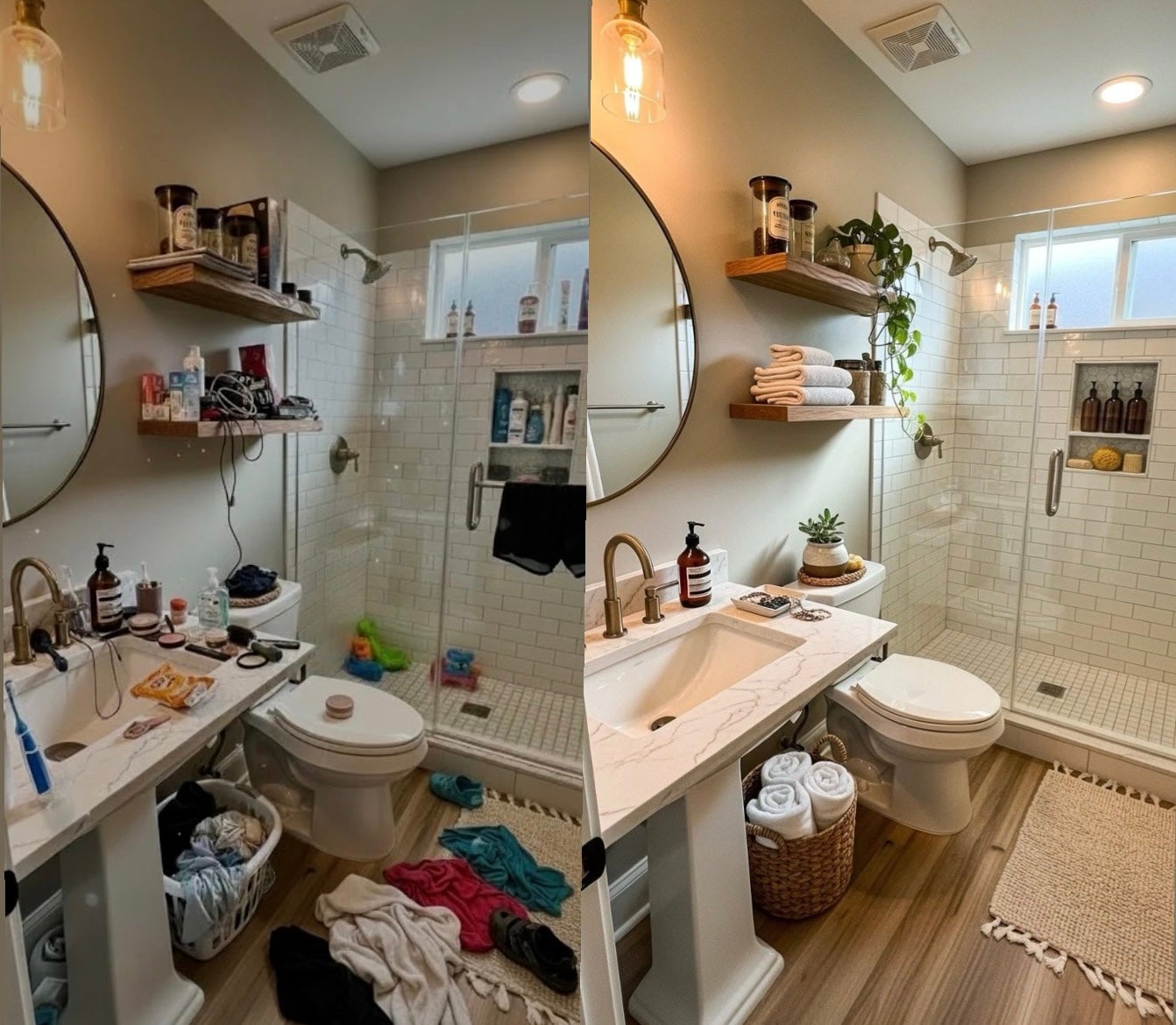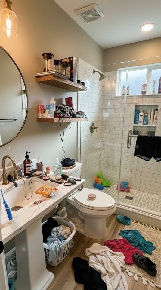 Products all over the counter, kids’ toys in the shower, a laundry basket in the middle of everything. Getting ready felt rushed and chaotic.
