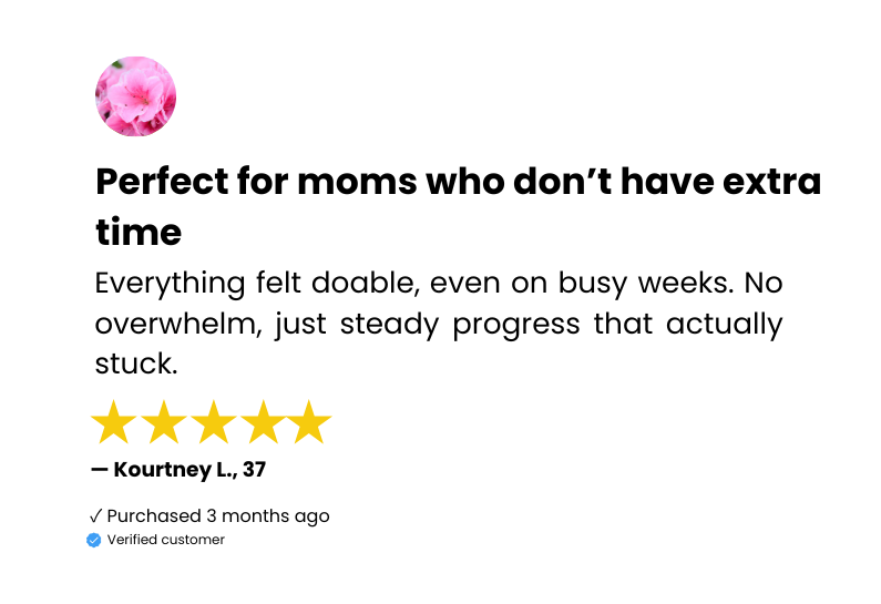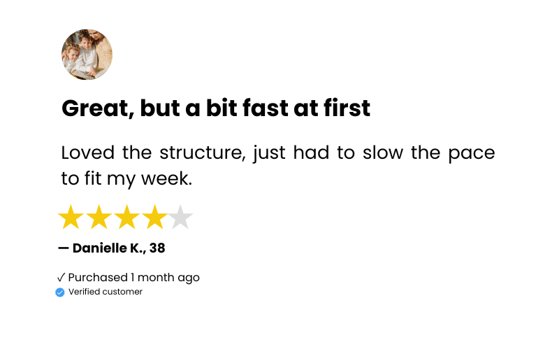 Built FOR working moms, but works for anyone: single professionals, empty-nesters, anyone with a job and limited energy. Non-moms actually have MORE time than our core audience, so you'll finish faster.